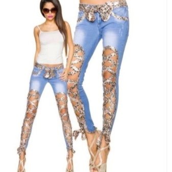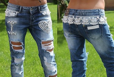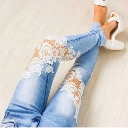 Jeans decorated with lace, only recently began to conquer the world famous catwalks, and many fashionistas liked it. Lace is found on the belt or in the knees.Jeans decorated with lace look elegant and stylish, so they can be used to embody a bow for a romantic date, or for every day.