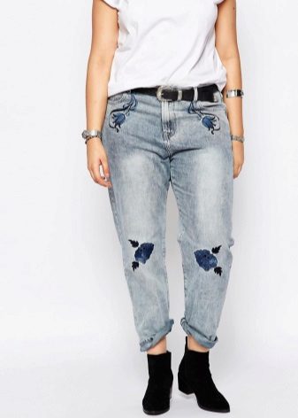 Owners of magnificent forms should choose jeans with embroidery from the waist to the bottom of the legs. Such a pattern, as a rule, is placed on the side and helps to lengthen the silhouette. Often embroidery can adorn the bottom of the legs or go down from the maple.