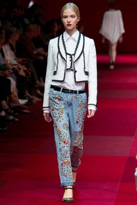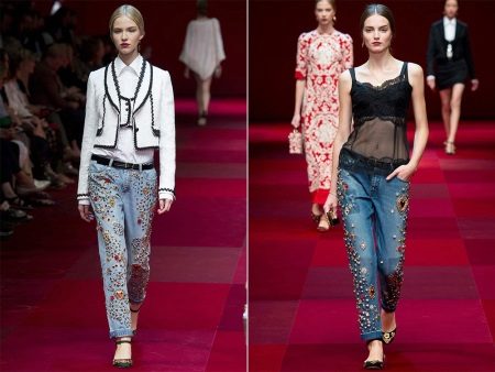 The fashion for jeans decorated with beads was 15 years ago. But today, these elegant decor elements are again in trend, and the bright and spectacular jeans models again adorn the catwalks.