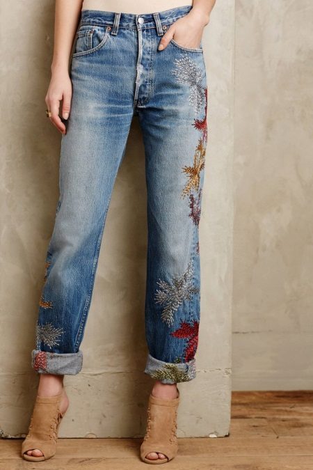 Some girls use cross-stitch to decorate jeans. This process is time consuming and complex. First you need to be patient and purchase all the necessary tools.