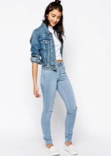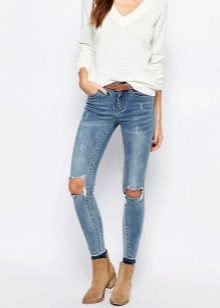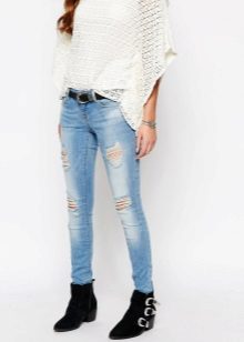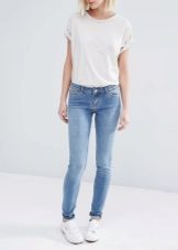 Blue skinny looks very gentle. This color is usually chosen by young girls. These pants go well with bright and bright things. Light blue jeans often have a worn effect or stylish holes.