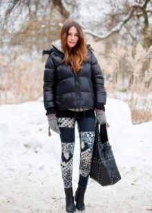 - Winter's tale: dark blue jeans with an unusual contrasting print, a puffed quilted jacket, resistant boots and a large bag that matches the color of the shoes.