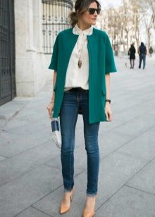 - Bright spots: Classic blue skinny jeans, a white shirt and a deep emerald cardigan. The image is complemented by a few restrained jewelry, shoes and a clutch of neutral colors.