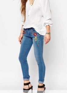 - Coloring, decorative elements and a pattern on skinny jeans also play a role. A win-win option is the classic blue and blue models. Dark and cold shades will visually make you slimmer, and light and warm will add volume, but only slightly. Vertical stripes, including zippers, stretch and narrow the figure.