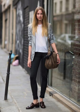 - Simple and elegant: black jeans, a loose white shirt, a gray jacket with casually tucked up sleeves, comfortable loafers and a spacious bag.