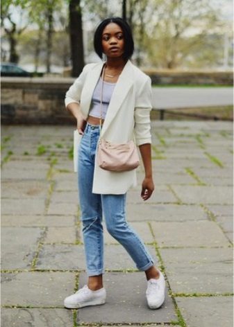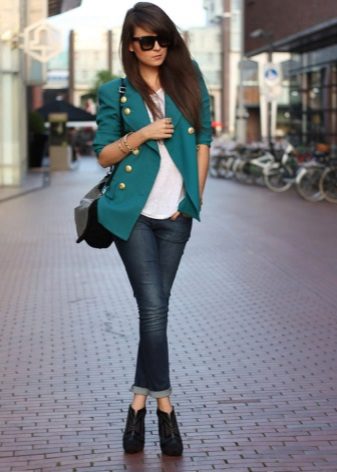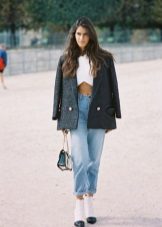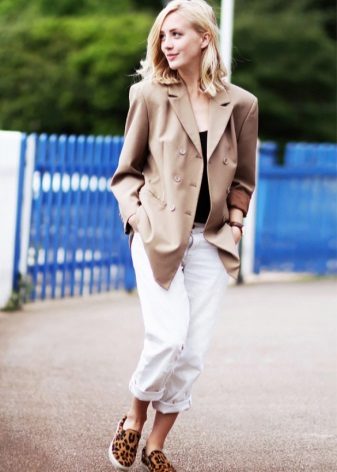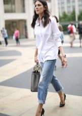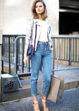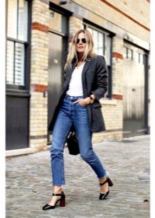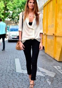 A feminine look will create a tandem of black cropped jeans with a white blouse. Decoration will be exquisite sandals, decorated with beads. Add a stylish jacket with a male cut in a light shade.