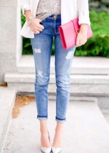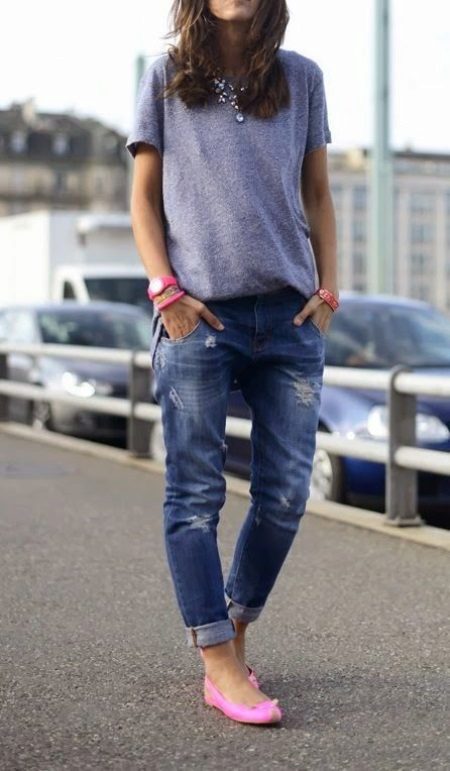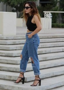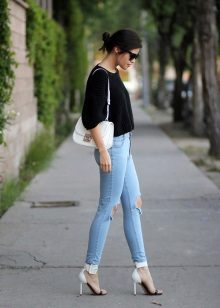 For the embodiment of a youth image, it is worth giving preference to jeans with scuffs or holes. They look great in tandem with a bright T-shirt, decorated with a unique print. Sandals with stiletto heels will give a silhouette of harmony.