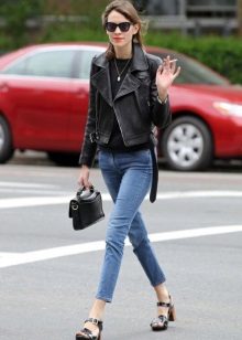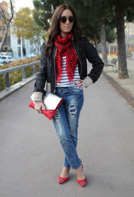 Wear a striped t-shirt and a black leather jacket for a casual look with cropped jeans. Red stiletto sandals will become a fashionable accent, which will emphasize a luxurious scarf, matched to match the shoes. A red clutch bag will complement the unique look.