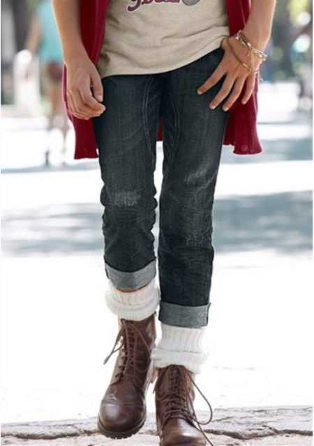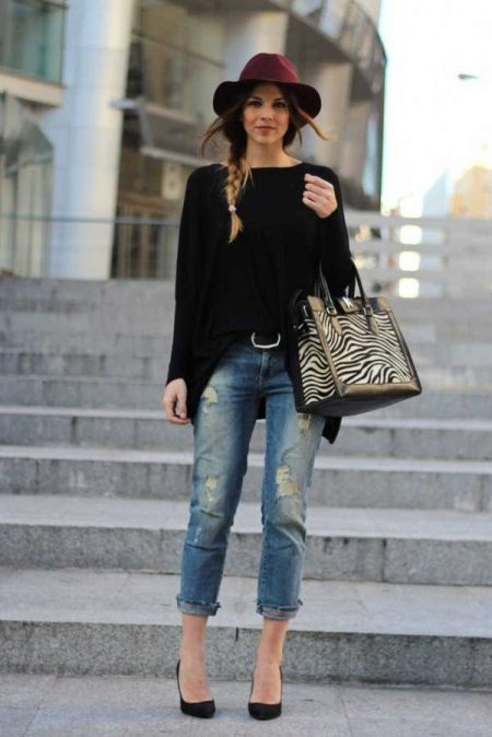 In cool weather, cropped jeans can be safely worn with ankle boots or boots. An excellent solution would be knee-high boots, decorated with ethnic patterns and high heels.