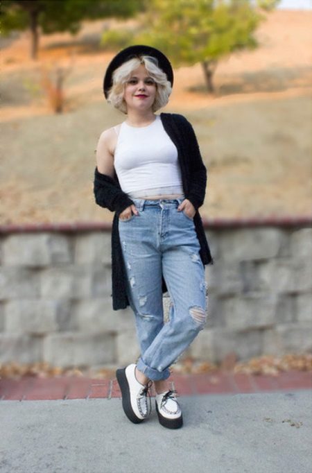 Young people prefer to wear wide jeans, which have many pockets, are decorated with various decors and have lacing at the bottom of the legs. This jeans model looks stylish with an elongated T-shirt that fits freely on the figure, with a T-shirt or a slightly stretched pullover of small knitting. A great addition would be flat shoes like boots, sneakers or sneakers.