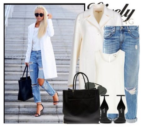 Cropped jeans with holes in the ensemble with stiletto sandals, a snow-white tunic and a white elegant coat look very impressive. A large black bag will perfectly complement a stylish bow.