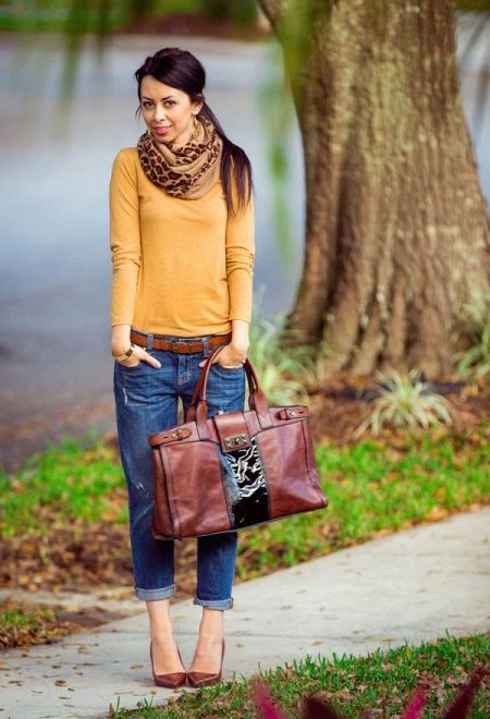 The combination of blue cropped jeans with a yellow sweater and a leopard scarf looks elegant. A stylish strap will add brightness to the look, and graceful brown stiletto heels and a large bag to match the shoes will become a luxurious addition.