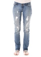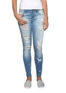- Artificially aged denim youth skinny jeans. The main feature of this model is a modern, stylish decor: bleached fabric and tears along the entire length of the leg.