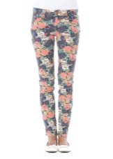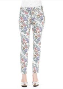 - Bright jeans with a bright floral print. They fit perfectly on the figure, as they are sewn from stretch material. The model has a tight-fitting silhouette and a classic fit.