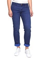 - Deep blue cropped jeans with light scuffs. This model fits tightly and has a high fit.