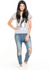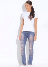 - Straight pants in light blue denim with a worn effect and small holes. The advantage of this model is that it consists of 100% cotton.