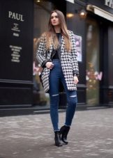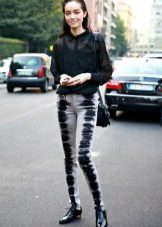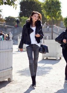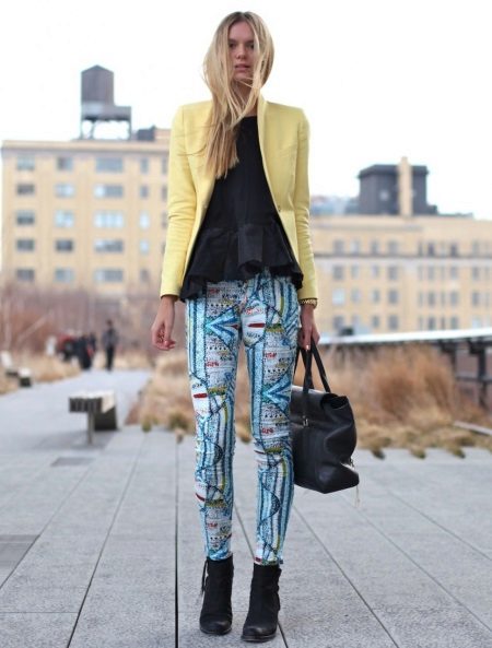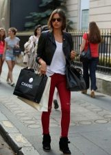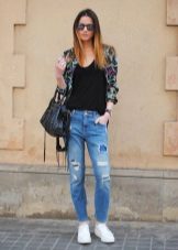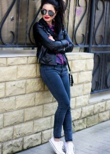 A youthful and bold image will turn out in a combination of skinny jeans with t-shirts decorated with large print (photos, drawings, etc.) and sneakers.