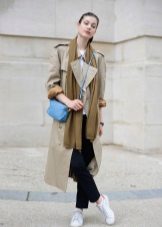 In such an outfit, a plain t-shirt or sweatshirt with a print repeating the palette used in sneakers will be appropriate. It is important to remember that in this season, a massive leather bag (black or brown) still looks particularly stylish in this outfit.