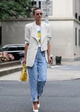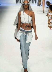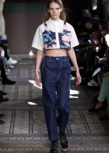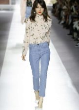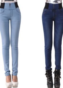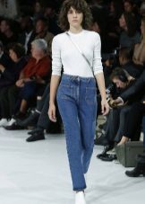 Jeans with a very high fit change the silhouette beyond recognition. They give a seductive look, visually stretch the entire figure.