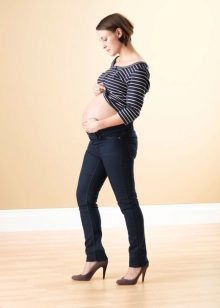 Modern designers develop and produce a lot of models specifically for expectant mothers. They comply with all fashionable proportions, while such models do not squeeze too much neither the tummy nor the legs.