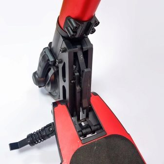 The front unit of the device (wheel and steering rack) are attached to the main part of the scooter - deck. The mounting mechanism is also folding mechanisms, which allows you to lower the steering rack to the deck and fix its position. When folded, the steering column and deck are parallel to each other.The fastener mechanism is equipped with Euro bolts with hexagonal sweat, which allows it to be completely disassembled for maintenance.