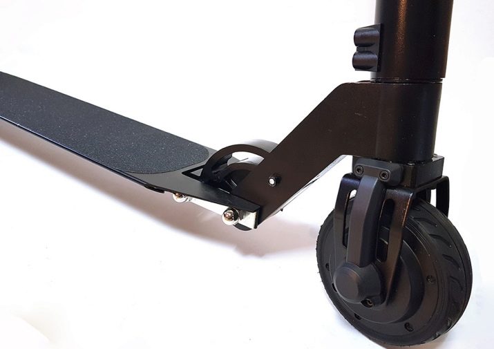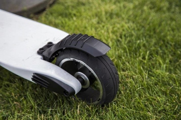 The rear wheel is attached to the deck with a hub. It is made in the form of a cast chromed disk of various configurations. Just like the front, the rear wheel is equipped with a durable rubber tire that does not miss. To protect against splashing, a protective wing for the rear wheel is provided, which is also equipped with a brake function. To activate it, you need to press the wing with your foot, which is closer to the rear wheel.