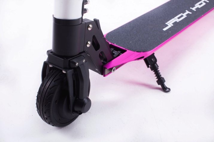 The latest models of Jack Hot scooters are equipped with a front suspension, which is made in the form of a spring with a vibration damper. Such an addition does not completely compensate for the vibration, but reduces the load exerted on the steering rack and all the mechanisms in it.