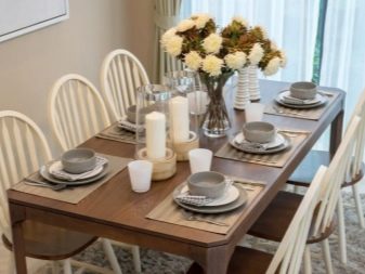 The table layout of the dining table implies that tablecloths and napkins visually match, no different from the rest of the room’s interior. If you are not preparing for a thematic holiday or are unfamiliar with the tastes of the guests, it is better to do with the simplest monotonous fabric. Bright colors will distract the attention of those gathered in the kitchen, they do not contribute to a positive mood. On a typical day, pastel-colored tablecloths are preferred; on the most important days for you, there should be a white canvas on the table.