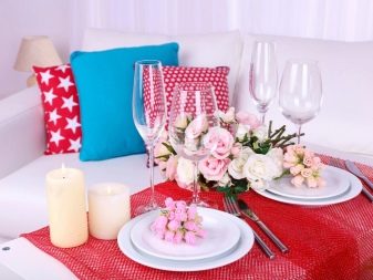 Ordinary sketchy arrangement of cutlery (even using napkins) can be boring and fresh in a solemn moment. To diversify the design of the table, decorative objects help to bring a feeling of freshness. They are very different: these are satin or silk ribbons, porcelain figurines, balloons. The composition of jewelry and their arrangement are thought out in advance, ideally they are agreed with all the participants of the celebration (except for those who are preparing a surprise).