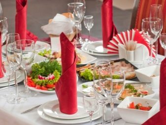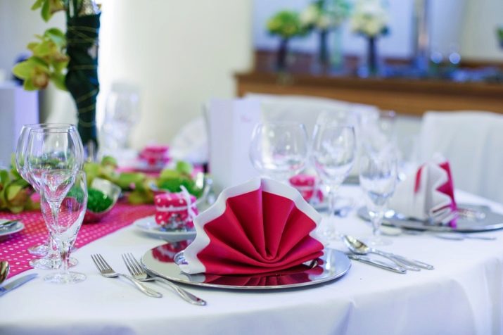 It is permissible to arrange napkins and point on the table, arranging several pieces in one figure. This will allow each guest to take as many napkins as he needs, and not be limited only by the amount that is at hand. Also in this case, it will be possible to distribute thematic figures according to the status of guests, arranging, for example, cool elements from the youth, modest rag “flowers” near respectable ladies and cheerful bunnies in the children's part of the table.