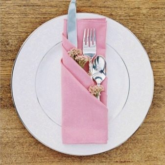 - The location of the napkin on the table is also very important. More often it is placed on the plate itself or to the left of it. If you have chosen the option with a pocket for cutlery, then put it to the right of the plate. Sometimes a napkin is placed in a glass.