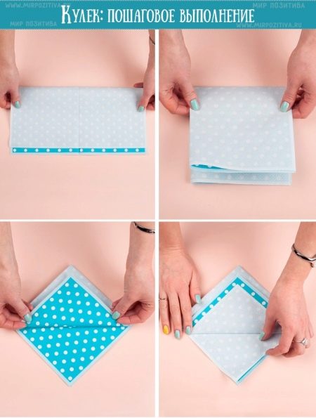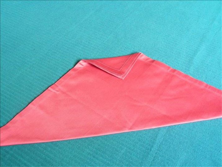 - it is necessary to bend the rag napkin in the mid-horizontal line, connecting the upper corners with the lower ones.The fold should be on top, the free edges on the bottom;