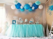 For those who celebrate a birthday in winter, cold colors should be used in the decoration of the room, crystal glassware, porcelain, silver appliances are placed on the table, lacy napkins are laid out. For winter decor, combinations of blue and white are used, with it you can combine silver and blue shades. In winter, lit candles will be appropriate, which are interestingly in harmony with decorative snowflakes and artificial snow.