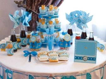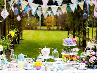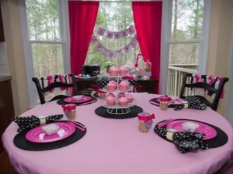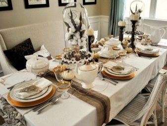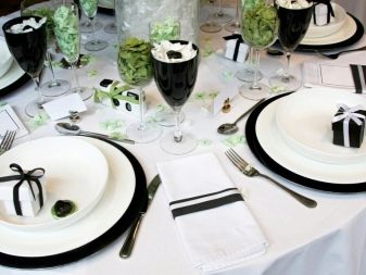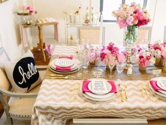 The table for the celebration is made out in a certain color scheme. If there are dishes in the flower, floral motifs are used, making out the serving. Black-and-white gamut looks spectacular, complemented by pale pink and gold. Such a decision will make the event more sophisticated. The table is supplemented with textiles and utensils on which there are strips, zigzags or polka dots.