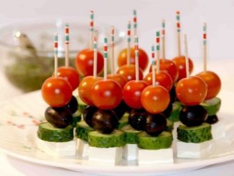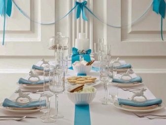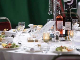 Particular attention should be paid to an interesting and original arrangement of dishes. On the table put small canapes on skewers or tartlets that are convenient to take with your handsbecause they do not break. Bottles with drinks are decorated with bright ribbons, the color of which should correspond to the general tone of the serving.