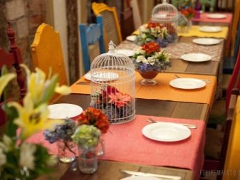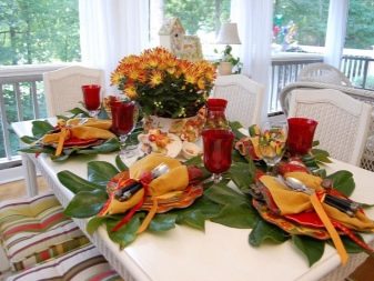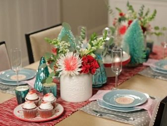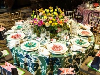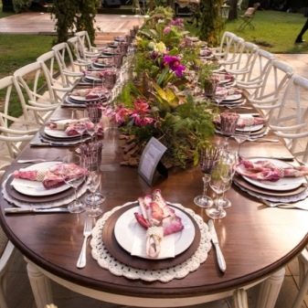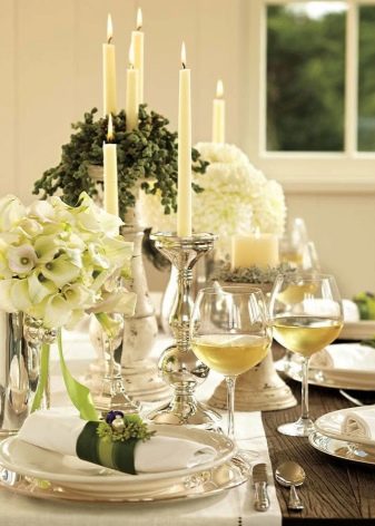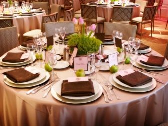 The festive table is complete without flowers. In the center should be a large crystal vase to create floral arrangements. It is worth paying attention to other little things that complement the decoration of the festive table. Cards are prepared in advance indicating the location for a particular guest. This will eliminate the crush at the table and embarrassing situations. Such cards should be originally signed, you can do it in a comic form.