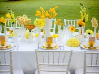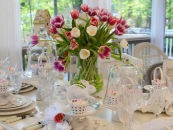 For the spring celebration, delicate shades will be relevant. Bouquets of tulips or hyacinths, delicate daffodils are placed on the table. You can add an accent in the form of decorative butterflies. Such a solution will be definitely appreciated by all those present at the event. To decorate the spring holiday, light green and yellow shades with white dishes will be a good combination. The tablecloth is chosen from natural fabric with delicate patterns. Bouquets with the first spring flowers are placed on the festive table.
