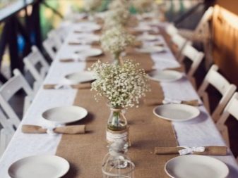 When organizing an anniversary for 50 or 55 years, you should seriously prepare for the reception and decide how to effectively decorate the room and which dishes to put. You can arrange a birthday table for a man or woman in a rustic style. For this, products and textiles made from natural materials are suitable. On the table should be laid a linen tablecloth, cotton napkins, put pottery, wooden items. Instead of crystal vases, banks are used that are wrapped in burlap, and wildflowers are placed in them.
