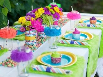 For a summer table, colors in sunny and bright colors are suitable. In the summer they use bright colors, many colors, colored tablecloths and napkins. They put fruits in wicker baskets; small bouquets of flowers are decorated with bright ribbons. Such compositions will make the table more festive. Summer birthday parties can be enjoyed with a Hawaiian party, decorating the celebration with tropical fruits.