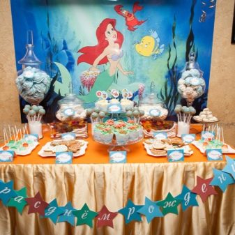 For children they put a treat separately. It’s better to put disposable thematic dishes on their table, as children can fool around and accidentally break glass. They design a children's table with imagination in order to interest and surprise the children. Suitable dishes with beautifully chopped fruits, vases with ice cream, cakes.