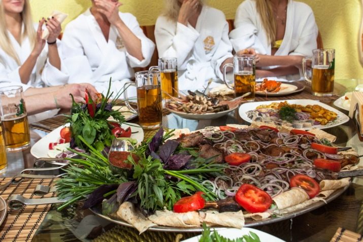 If the celebration is celebrated in the sauna, you should take care of hearty and varied dishes, alcoholic beverages, juices. Determining the main course, take into account the preferences of the guests. More often meat dishes are prepared for the holidays. In addition, you can also serve fish delicacies, which will always find a place on the festive table.