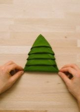 After these actions, the napkin must be given a triangular shape, forming folds. First, this is done with the lower right corner. Then - with the upper right. What happened is folded in half. So they make a simple Christmas tree with their own hands for serving a New Year's table.