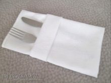 This option will be a great addition to a table set for an official event. Outwardly, it looks like a cutlery pocket. It is not difficult to wrap a textile product in a sachet, for this you need to put it face up. First, the square material is folded in half, then a third of the upper part is turned down to obtain a central fold. The design flips over, and its two edges are connected in a neat center line. The procedure is repeated on this side, after which the sachet is ready and cutlery can be put inside.
