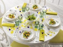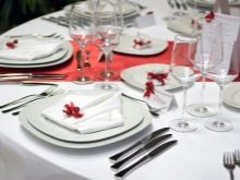 - A tablecloth must be present on the table. This will give even the most ordinary meal a festive and solemn mood. It is better if the tablecloth is a light shade. Dishes on such a canvas will look stylish. According to the rules, the tablecloth should hang no more than 30 cm from the edge of the table.