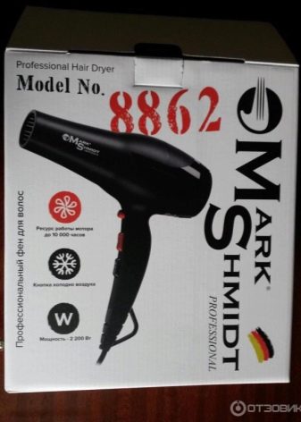 - Professional hair dryer Mark Shmidt 9610 ionic. Powerful model (2200 W), 3 nozzles included, one of which is a diffuser. The hair dryer has a sturdy case and a long cord (3 meters). There is a separate regime of cold air flow, in addition to 6 main modes. During operation, the device does not overheat and cools quickly.
