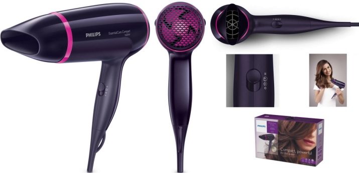 The first Philips hair dryer model I want to say about is Philips BHD002 Essential Care Compact. It has a dark purple body. There is a removable hub. The length of the electric power cable is 180 centimeters. The power of the device is 1600 watts. One of the features of the BHD002 Essential Care Compact is the ability to work in 3 modes. Also available cold air supply.