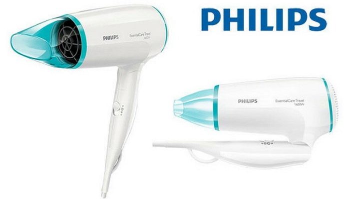 The next model that deserves attention is the Philips BHD006 Essential Care Travel. It has a blue and white body. A hub is available. It belongs to the category of portable because of the folding handle. Included is a special case for storing a hairdryer. Power model is 1600 watts. There are 3 operating modes. Just like the previous model, it has the ability to supply a cold air stream.