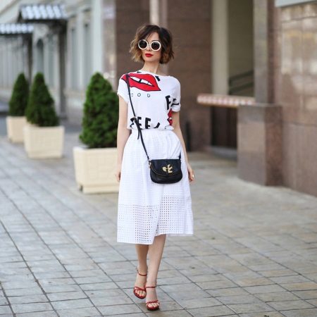 Girls can wear t-shirts decorated with a voluminous pattern, with skirts in a casual style. You can put on a jeans shirt or a leather jacket over a T-shirt - you will get a comfortable and stylish outfit for different occasions.