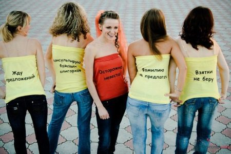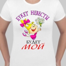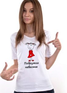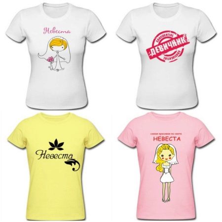 A t-shirt may simply have the signature “bride”, and a doll in a wedding dress can also be painted on it. However, often brides choose humorous remarks.