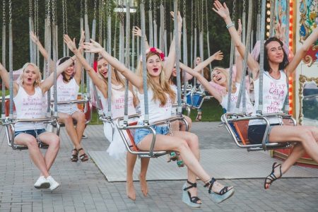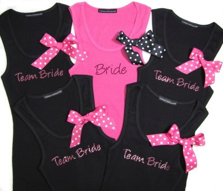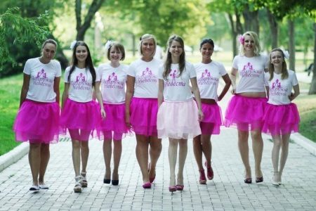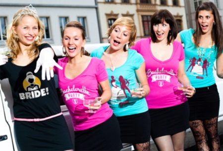 Having decided to put on unusual t-shirts for a bachelorette party, it is best that they be in the same style. This will give the image of a single team of bridesmaids.